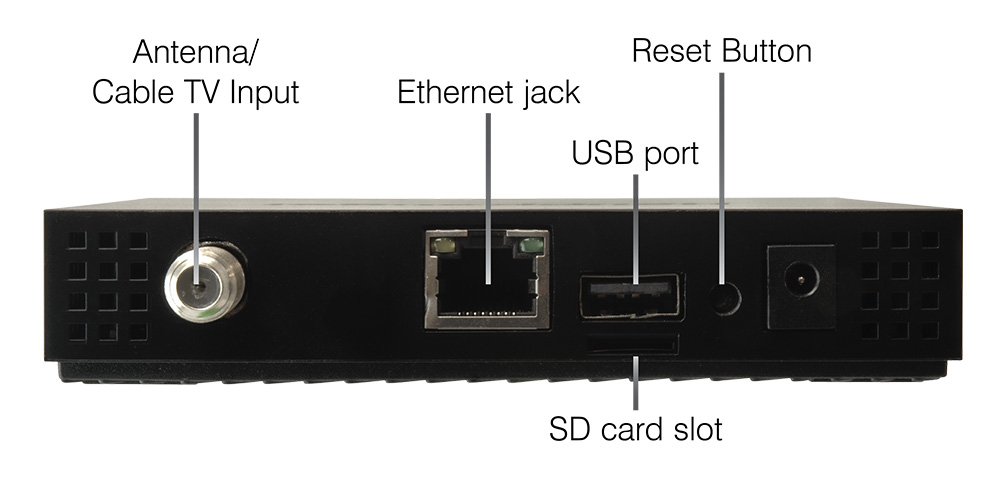 model 01653: Cordcutter TV with two sets of ATSC and clear QAM receivers. Dual transcoders. Wi-Fi support: 2.5/5Ghz. Ethernet port. USB and SD card slots. F connector for ATSC over-the-air antenna or clear QAM cable TV.