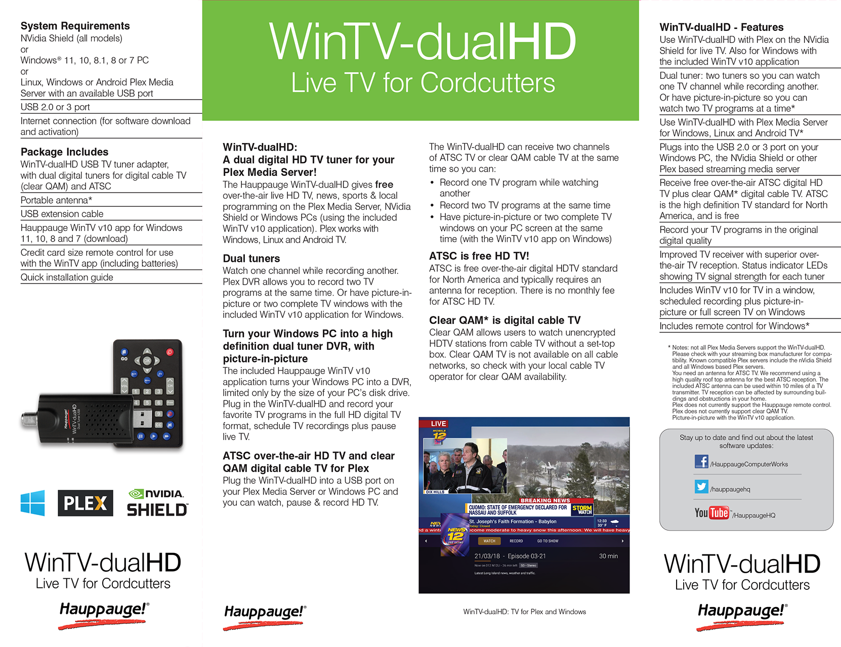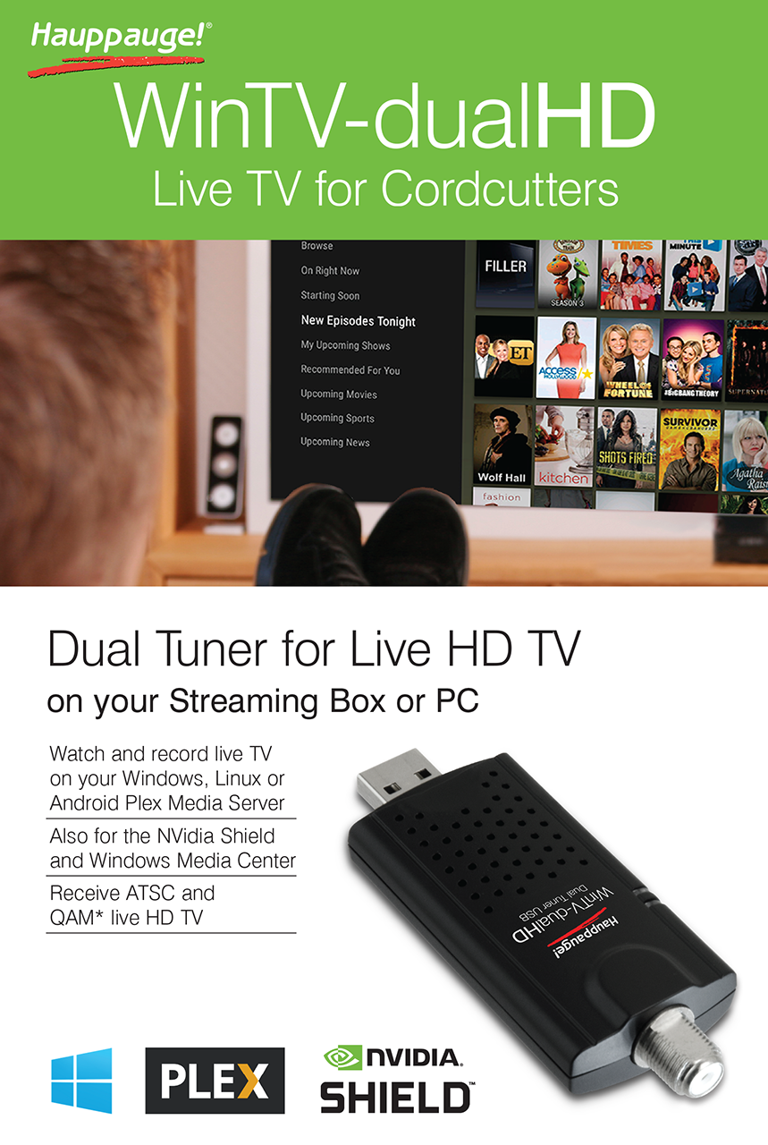 - Live free over-the-air TV for Plex. Watch and record local TV programs with Plex. Use your Plex Media Server as the ultimate DVR. WinTV-dualHD for Cordcutters runs with Plex in Linux, Android and Windows. Also for the Nvidia Shield with Plex and Android.