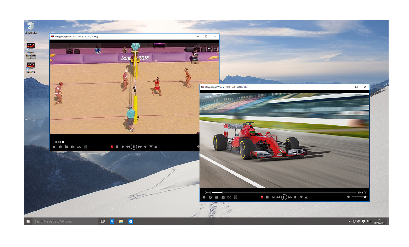The WinTV-dualHD comes with the new WinTV v10 application for Windows. With WinTV v10, you can watch or record your favorite TV programs in your PC, in a window or full screen. With the WinTV-dualHD, WinTV v10 can record two TV programs at the same time, record one TV program while recording another, or display two TV programs on your PC screen at the same time. You can choose either picture-in-picture or have two complete TV windows on your Windows screen.
