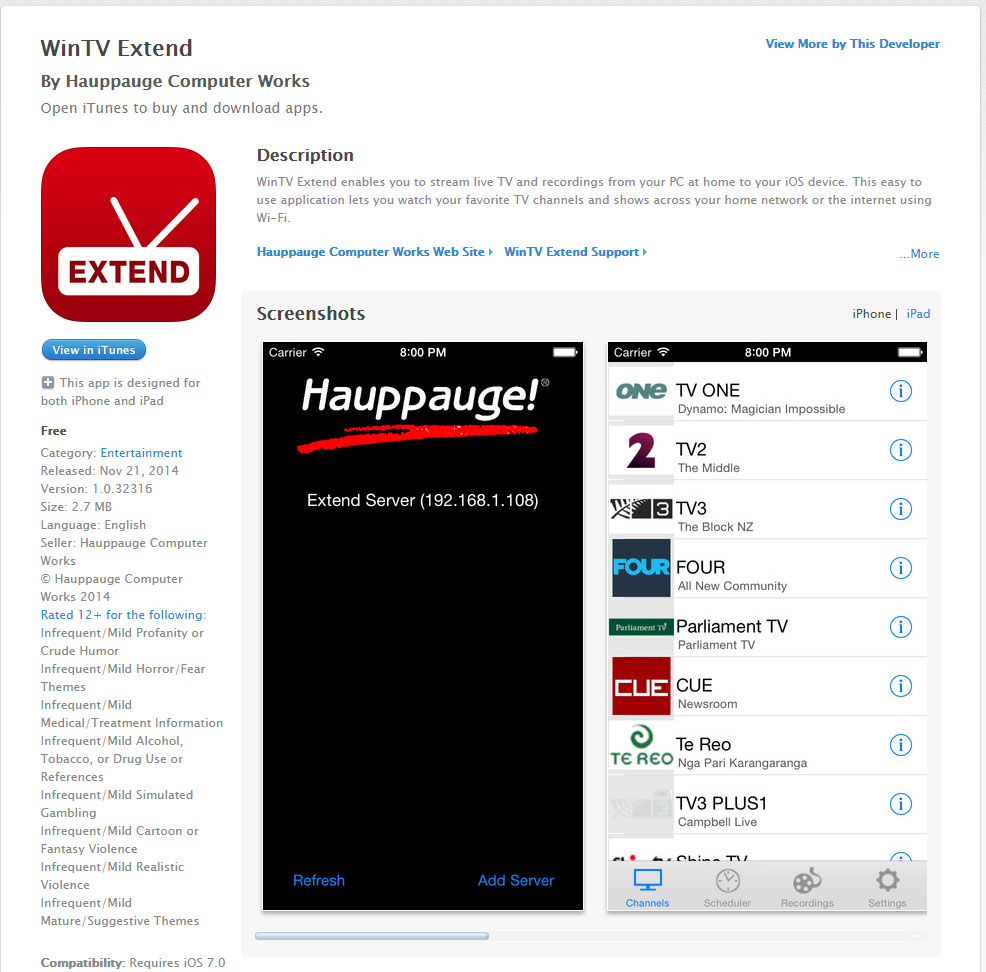 Latest version of the Hauppauge WinTV Extend app for the iPad/iPhone