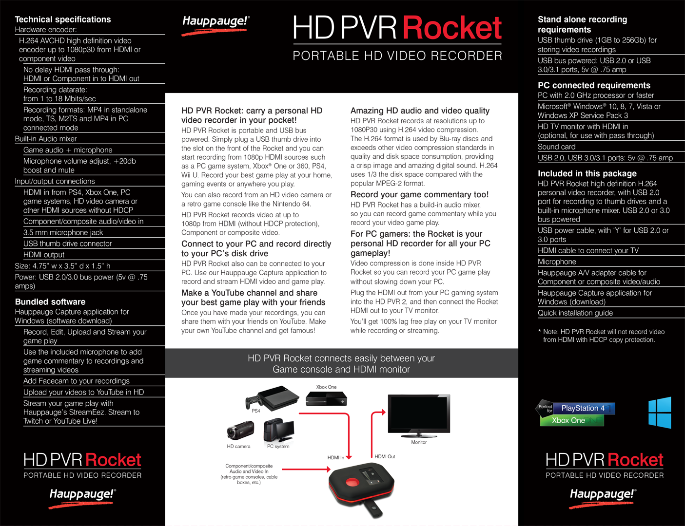 - HD PVR Rocket high definition H.264 personal video recorder, with USB port for recording to thumb drives and a built-in microphone mixer (stand alone mode). USB 2.0 or 3.0 bus powered