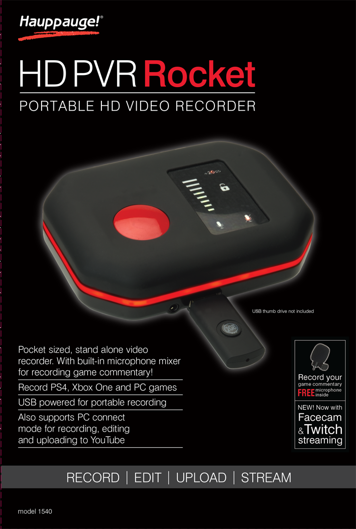 HD PVR Rocket is portable and USB bus powered. Record your best game play at gaming events or at your friends home. Simply plug a USB thumb drive into the slot on the front of the Rocket and you can start recording your game play from a PC game system, Sony PlayStation® 3 or 4, Wii U or Microsoft Xbox® One or 360.