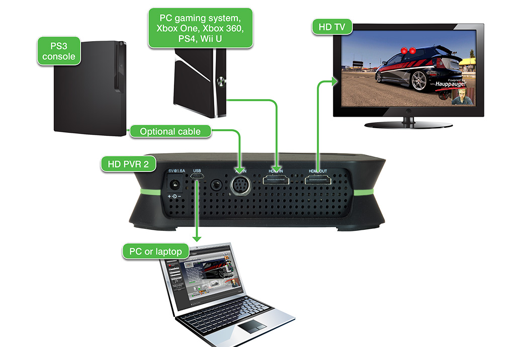 HD PVR 2 Gaming Edition comes with real-time video pass through, so you can watch your game play on your HD TV while recording your game on your PCs disk drive. Simply connect HD PVR 2 in between your game console and your HD TV set (HDMI in and out plus Component Video cables included).