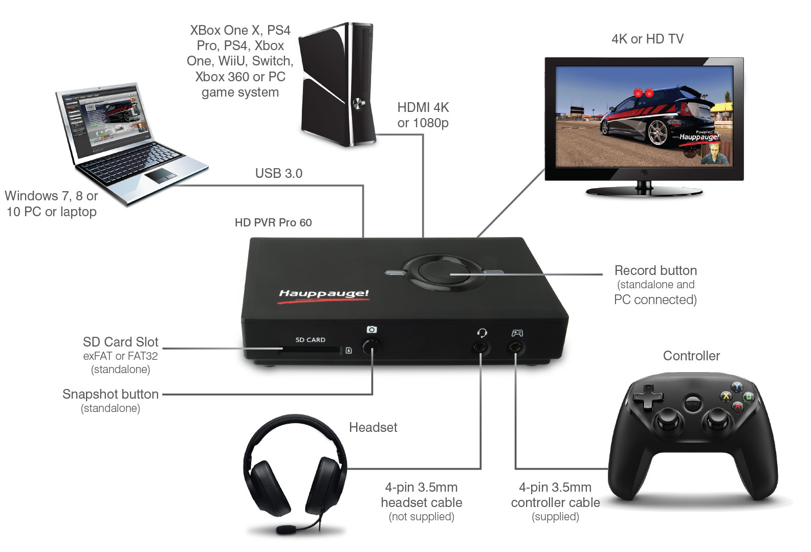 The HD PVR Pro 60 can be connected to your PC so you can record or stream. Or you can plug in an SD card (full size up to 256GB, formatted as exFat or FAT32) and disconnect the HD PVR Pro 60 from your PC and record stand alone. In standalone mode, the Pro 60 still can connect to 4K video sources.