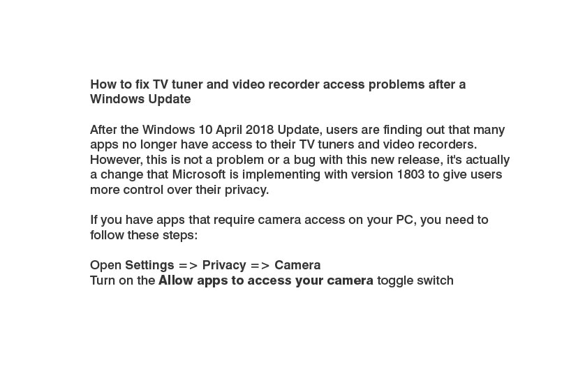 This is a known "feature" of the new release of Windows 10, related to video cameras but also affecting TV tuners and video recorders.