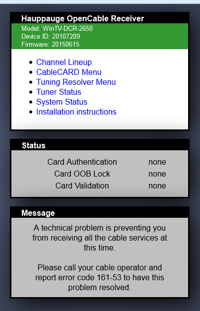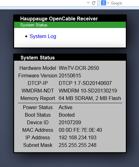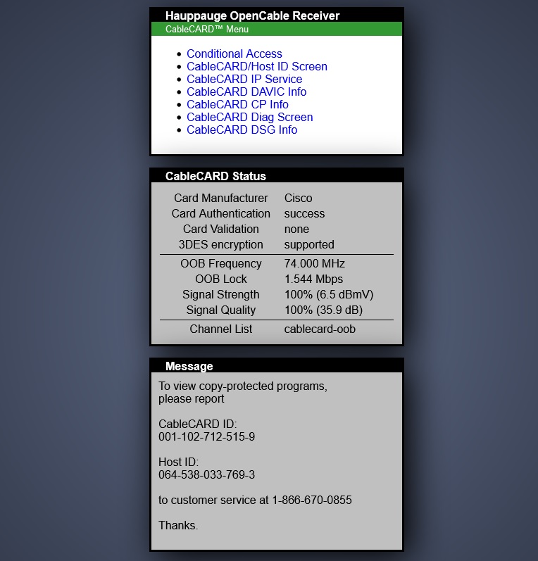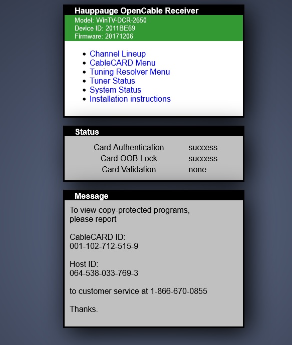The web interface allows you to check that you have the latest firmware. You can also find your CableCARD ID and the Host ID.