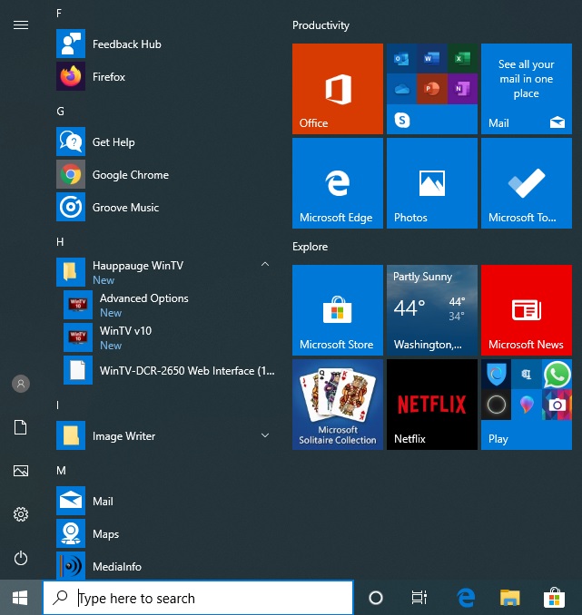 Once the WinTV-DCR software is installed, click the Start button on your keyboard. Scroll down until you see All Apps. Scroll across look for Hauppauge WinTV. It might be in the 'H' list or it might be simply called out as Hauppauge WinTV.