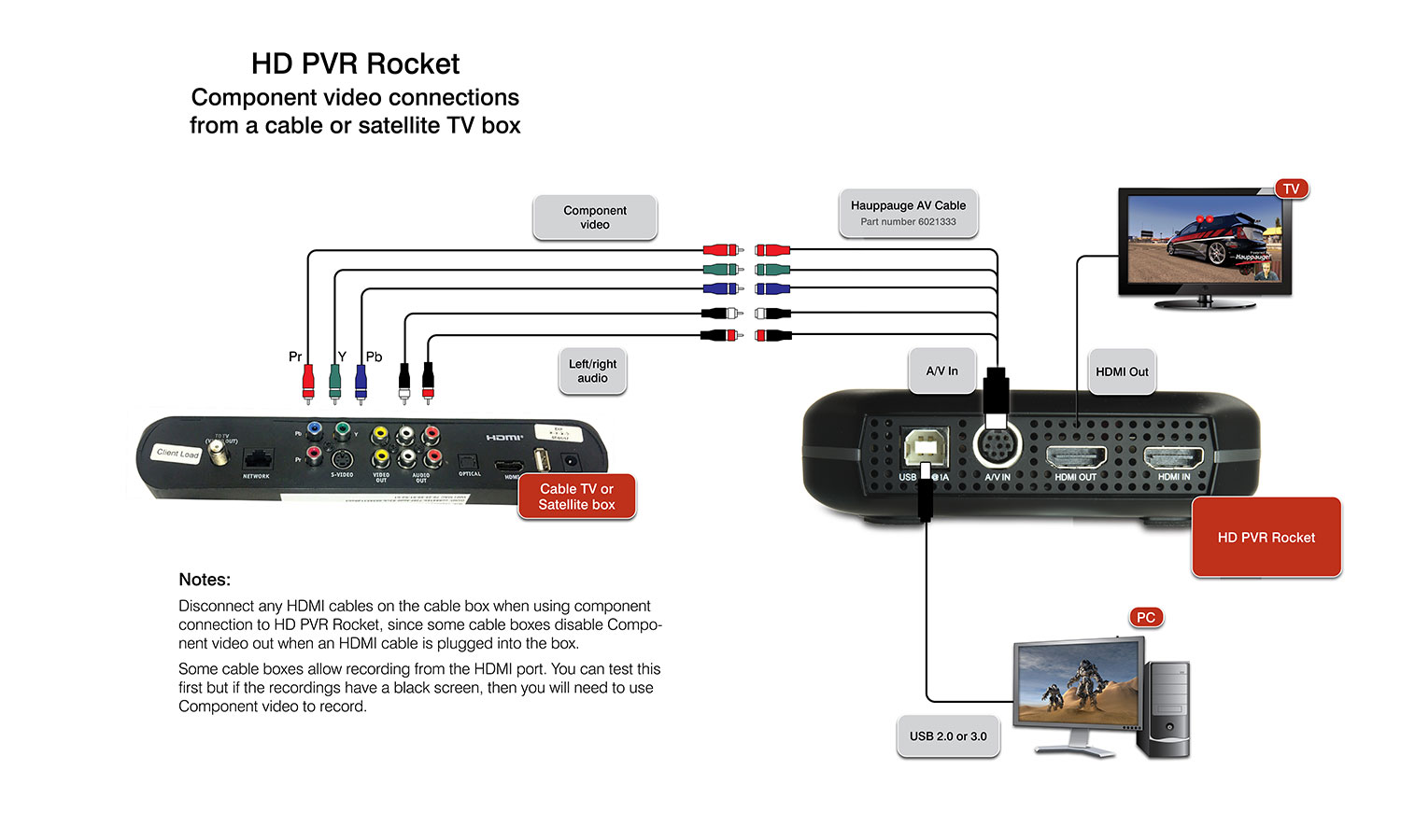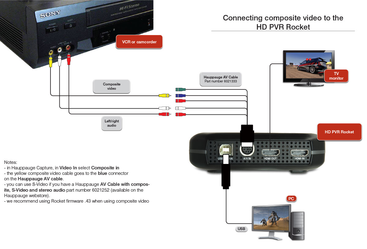 - First: check the video connections. If you are recording from HDMI, make sure that your video source does not have HDCP copy protection. If you are using Composite video, check to make sure the Yellow composite video connection is going to the Hauppauge A/V cable's Blue video connector. If you are recording from a PC, make sure the HDMI output is enabled (normally you have to hit the F4 key to turn on the HDMI port).