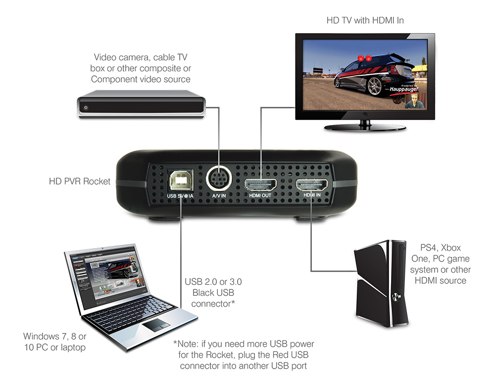 Note: Make sure you have installed Hauppauge Capture before updating the firmware. And if you are powering the Rocket from a PC, plug in BOTH the RED and BLACK USB connections to assure adequate power during the firmware update.