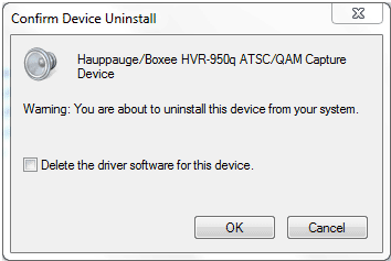 - Repeat the uninstall for the other two WinTV-HVR-950Q entries (Note: you won’t be asked to ‘confirm device uninstall’ again)