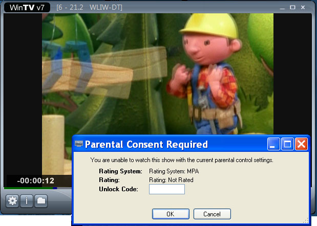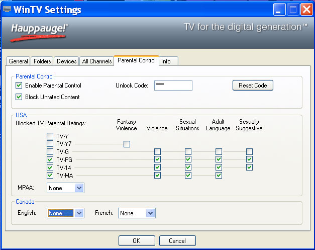 WinTV v7allows you to enable Parental Control on digital TV programs. To enable Parental Control, click the Parental Control tab in the settings menu. Once you set a password in 'Unlock Code' and click on 'Enable Parental Control', you can set the ratings allowed for watching and recording TV.